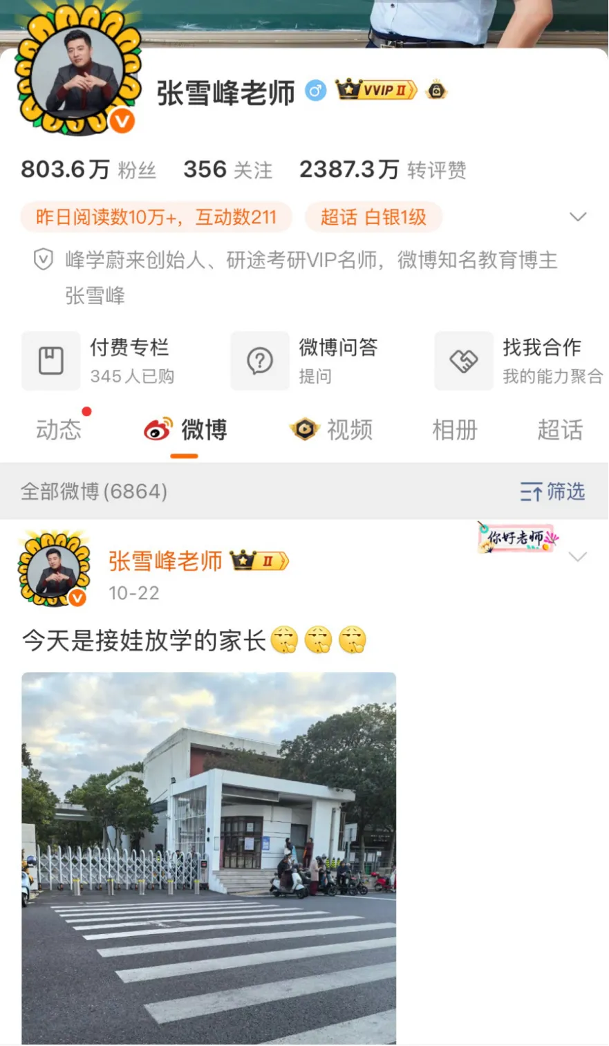 03超百万考生被张雪峰改变截至目前,张雪峰在全网粉丝量超5000万。账号解封仅5天,张雪峰的微博账号涨粉3000人。关注张雪峰动态的人们中,有忠实粉丝,但更多人看张雪峰,只是为了看个乐子。